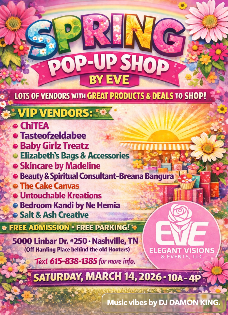 Get into the SPRING of things with a fresh Pop-Up Shopping Event, Saturday, MARCH 14TH, from 10 AM to 4 PM in Nashville! Shop several amazing local vendors including: ChiTEa, TASTEOFZELDABEE, Elizabeth's Bags & Accessories, Skincare by Madeline, Beauty & Spiritual Consultant, Breanna Bangura, The Cake Canvas, Untouchable Kreations, Bedroom Kandi by Ne'Hemia, Salt & Ash Creations, and BabyGurl'z Treatz and many more...